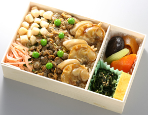 海の見えない現在の品川駅で、鉄道開業時の海を見渡せた頃の品川駅に思いを馳せながら食す一面貝づくしの海鮮弁当。数種類の貝の風味と食感が、ビジネスマンや旅行客の食欲をかき立てる。