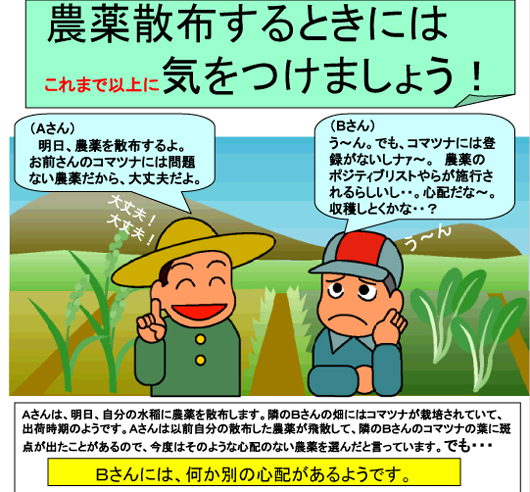 農水省も農薬の飛散によるポジティブリスト制違反を警戒し、注意を促すリーフレットを大量に配布した