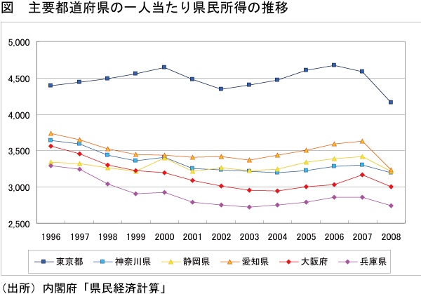大阪の一人当たり所得は、96年で愛知、神奈川よりすでに低かったが、現在は静岡にも抜かれた。大阪だけでなく兵庫県の所得も低下している。関西圏が地盤沈下している。住民がなんとかして欲しいと思うのは当然だ。
