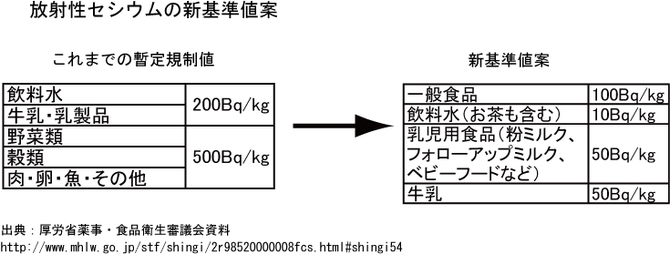 放射性セシウムの新しい基準値案は、一般食品が1kgあたり100Bq、飲料水10Bq、乳児用食品50Bq、牛乳50Bqです。これまでの暫定規制値は、飲料水や牛乳、乳製品などが1kgあたり200Bq、それ以外の食品は500Bqですから、数値がうんと小さくなり厳しくなります。