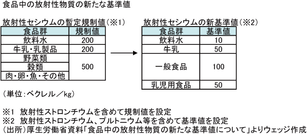 現在の暫定規制値で許容している食品からの内部被ばく線量を、最大5mSv(ミリシーベルト)/年から1mSv/年に引き下げることに伴う基準値の強化である(表参照)。