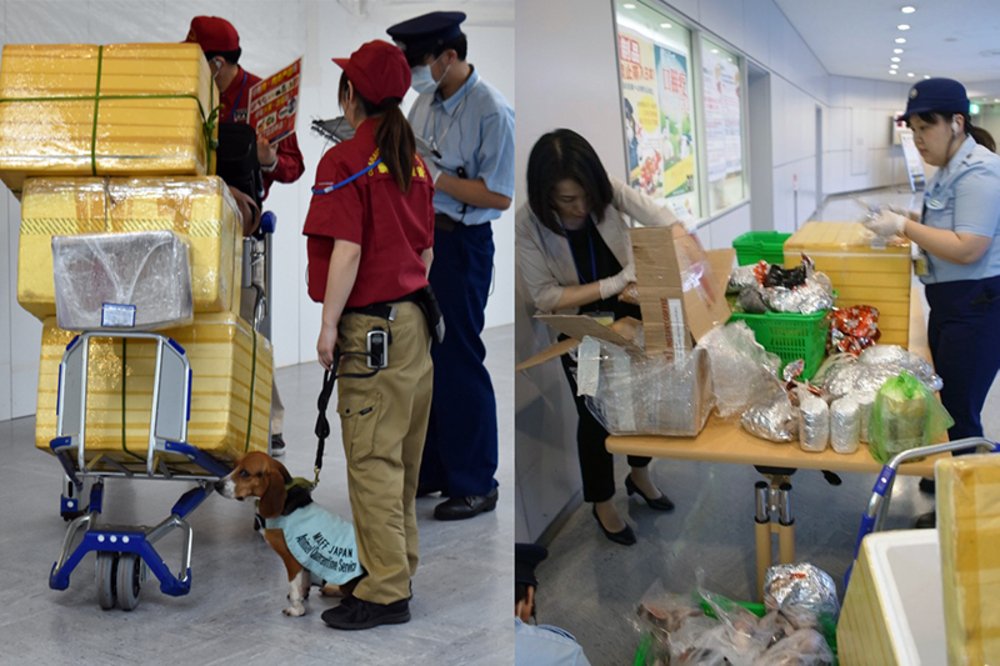 豚コレラは、海外からウイルスが入ってきたとみられています。そのため、農水省は空港や海港等での輸入検疫を強化し、ウイルスが付きやすい肉やハム・ソーセージなど加工品が国内に持ち込まれないように監視しています。豚コレラなどの病気がある国からの生肉や加工品はもともと、輸入禁止。しかし、こっそり手荷物などに紛れ込ませて持ち込もうとする事例が多発していました。そのため、検疫探知犬も増頭しています。また、今春から、違反を繰り返す場合には家畜伝染病予防法違反として警察に告発する旨を旅行者に伝えており、すでに4人が逮捕されています。