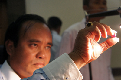 ルビーの品質をチェックするアウントン氏(写真:筆者提供)