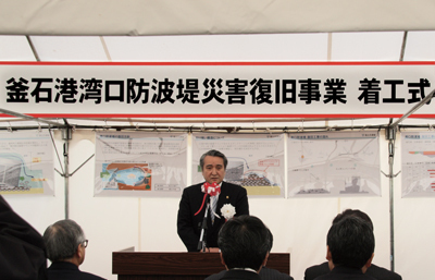 ギネスブックにも認定されている岩手県釜石市の巨大「湾口防波堤」の復旧着工式が2月最後の日曜日、釜石港埠頭で催された。約490億円かけて4年後の完成を目指す。野田武則釜石市長は「震災1年を迎える前に着工に移れたことはありがたい。湾口防波堤は、釜石復興の礎となる」と挨拶した。同時に「全国の人たちにも湾口防波堤の意義を理解していただきたい」と、付け加えた。
