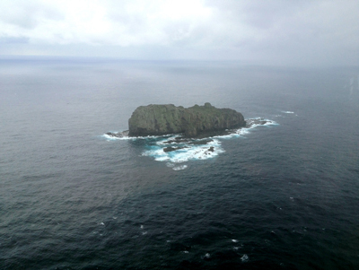 那覇から西に進路を取って慶良間(けらま)諸島の上空を通過すると、沖縄諸島最西の久米島を右手に眺めたのを最後に、ヘリの窓の向こうには東シナ海の深い青が続いた。1時間ほどすると、突然水平線から岩山が現れた。尖閣諸島を形成する大正島である。