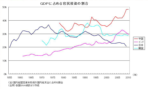 中国の経済成長は公共事業と企業の設備投資に大きく依存しており、その割合はGDPの約半分に達する。日本の高度成長期のピークが35%を超えた程度であり、90年代の韓国も同程度だったことと比べると、この割合は突出している(図1)。