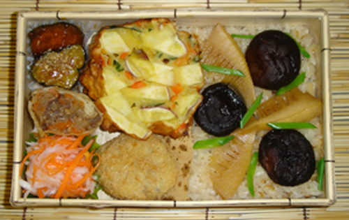 ふたを開けると、中身は茶色く明るかった。たき込みご飯の上にはシイタケとタケノコの煮物が乗る。「ガネ」と地元で呼ばれるサツマイモ入りの天ぷら(薩摩揚げ)が、けっこうな大きさで2分割されてすわる。コロッケの中にもシイタケとタケノコが入る。切り干し大根は春巻の皮の中に収まり、容器の隅でナスとカボチャが味噌田楽になっている。
