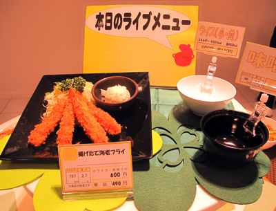 中でも特徴的なのは「ライブクック」と名付けられたコーナーだ。ここでは、注文のタイミングにあわせて調理してくれる。その調理作業を見る楽しみとともに目の前で出来たての「ライブメニュー」が完成するのだ。この日の「ライブメニュー」は「揚げたて海老フライ」。海老フライが4本もつくが、男性だけでなく女性も多く注文していたのが印象的だった。