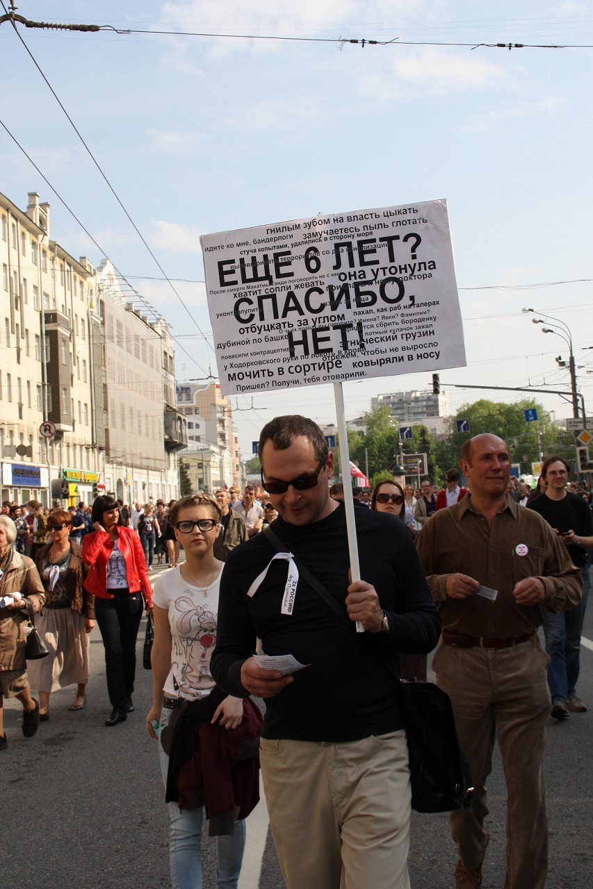 5月6日、ロシアの大統領就任式を翌日に控えた首都モスクワで、「21世紀のツァーリ(皇帝)」と呼ばれるウラジーミル・プーチン氏を批判する大合唱が、初夏の青空に響き渡った。