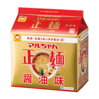 「マルちゃん正麺」(以下、正麺)は蒸しの工程がなく、生麺をほぐして円形にかたどって乾燥させている。一見、フライ麺のようにも見えるが、生麺であり、乾燥させることで即席袋麺の必須条件である長期間の保存を可能にした。「生麺うまいまま製法」として特許を出願している。