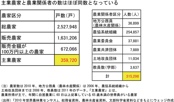 農業関係者の数に対して農家の数はどうか。「農家所得の50%以上が農業所得で、年間に60日以上自営農業に従事している65歳未満の世帯員がいる農家」である主業農家の数は約36万戸。職業的に農業を選択する農家とほとんど変わらない数の農業関係者がいる。さらに、販売金額が100万円を超す農家も約67万2千戸ある。この場合でも2戸に1人の農業関係者が張り付いていることになる。ただし販売金額100万円といっても、それで事業的に成立しているという意味ではない。