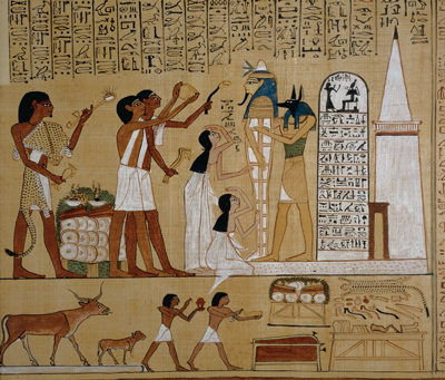 死者の書とは、試練に満ちた冥界を切り抜けるために、復活に必要な呪文を記した指南書。死者が供物を口にするための“口開けの儀式”や、冥界の王オシリス神による“審判”など、再生までの過程が順を追って描かれている。