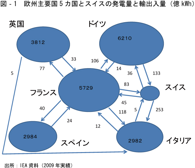 欧州連合主要5カ国とスイスの発電量と電力の輸出入量は図-1の通りだ。ドイツとスペインでは需要量は2倍程度違っている。また、電力輸出入は活発だ。フランスは世界最大の電力輸出国で発電量の8%を周辺諸国に供給している。