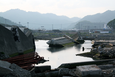 東日本大震災の津波で倒壊した岩手県大槌町の防潮堤 (撮影:編集部)