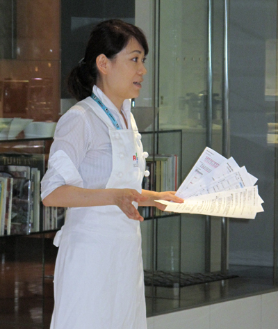 語尾を明瞭に言い切る、はっきりとした浅井さんの説明。これを聞いているのは、首都圏の店舗運営を任されている30数人の店長たちだ。男女比は半々、20~30代が多い。「ハーベスト食育ランチ」と名付けられたこの研修では、自社商品を食べながら「改めて食と自社商品について考えてもらうこと」を課題としている。店長やSV(スーパーバイザー)、本部スタッフへの研修を、2年半ほど前からほぼ毎日のように社食で行っている。