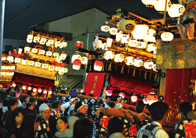 山車に提灯の明かりがともると、祭りの興奮も最高潮に