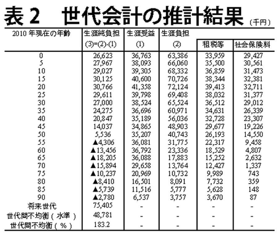 同表によると、大まかに言って、世代別に次のような特徴が見られる。すなわち、まず推計基準年時点で引退している世代は社会保障による受益が租税等負担を大きく上回るので受益超過となる。次に、推計時点では働いているものの、まもなく引退となる世代については、引退後受け取ることとなる社会保障給付による受益の現在価値が現在および将来にわたって支払う租税等負担の現在価値を相殺して余りあるため、生涯純負担はマイナス、すなわち、純受益世代となる。