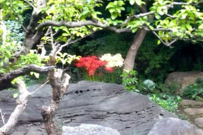 板橋の温泉のお庭にひっそりと咲く紅白の彼岸花。ちょいとピンボケですが。