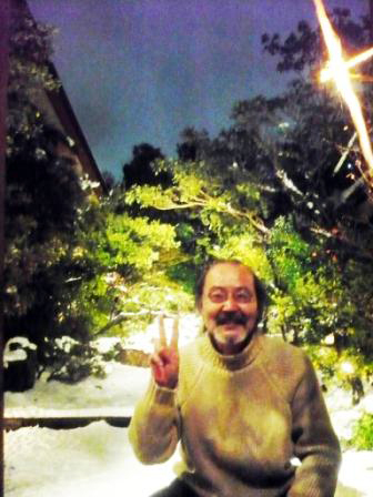 2013年1月14日の大雪の日に雪見露天風呂に繰り出した板橋の温泉の、雪が積もるお庭を借景に「はい、ポーズ」。娘が撮影。