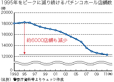 警察庁が毎年公表している「ぱちんこ屋等営業所数及び遊技機別備付台数」によると、2011年12月末のパチンコホール営業所数は、前年の1万2479店から156店減少し、1万2323店となった。1995年の1万8244店をピークに、16年連続で前年比減少となっている。近年の推移を見れば、07年12月末時点の前年比1089店減少が最大で、それ以降、年々減少幅は縮小しているものの、減っていることには変わりない。