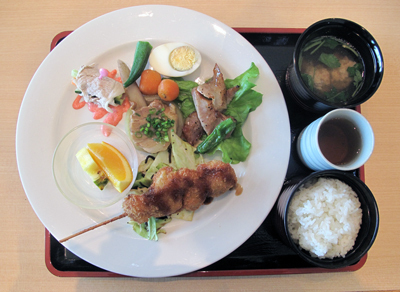 この日、24階特別食堂で試食させてもらった「コムウェアポーク尽くし御前」は1,000円。社食メニューとしては安くない価格だが、その内容に驚く。ダイコン、ニンジン、ゴボウ、煮卵、オクラが添えられた「豚バラ肉の煮込み 山椒風味」、キャベツの塩昆布和えが添えられた「豚ヒレ肉の串カツ」、明太マヨネーズで味付けされた「豚ロース、野菜スティック、チーズのロール、サラダ仕立て」、シシトウとグリーンカールを添えた「豚トロ塩焼き」。これらがフルーツと一緒にメインの皿に彩りよく盛られ、さらに三つ葉の乗った「豚肉のつみれ汁」も。ふっくらと炊きあがった白飯は千葉県産のコシヒカリだという。