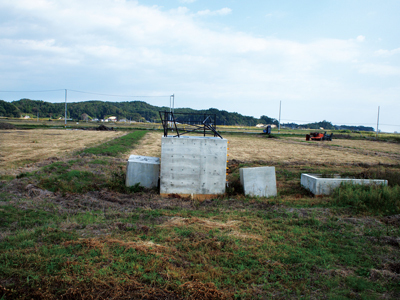 大規模化のための基盤整備の途中で被災し使い物にならなくなった用水設備 (奥に見えるのは倒れて放置されたトラクター)