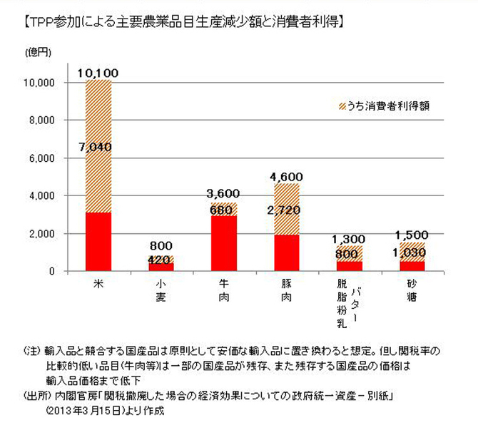 3月15日に政府が発表した「関税撤廃した場合の経済効果についての政府統一試算」では、別紙で農業生産額3兆円減少の内訳を主要農産物別に示している。そこでは、米、小麦、牛肉、豚肉、一部乳製品(バター・脱脂粉乳)、砂糖の主要農産物6品目で、生産減少額は合計2.1兆円となっている。