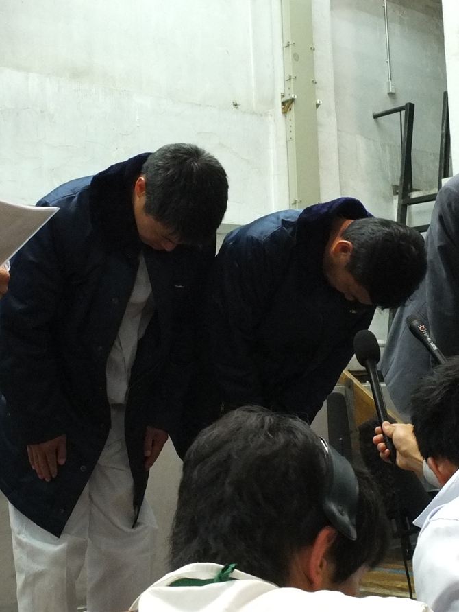 事故当日深夜に開かれた記者会見で深々と頭を下げる辛坊さん(右)とヒロさん
