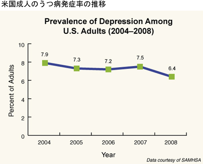 NIMHの「成人のうつ病発症率の推移」をみると、徐々に減少傾向となっています(表参照)。08年の統計では6.4%ですので、これだけみると日本の方が発症率は高くなってしまいます。(CDCのデータとは統計の仕方が異なるようで一致しない)