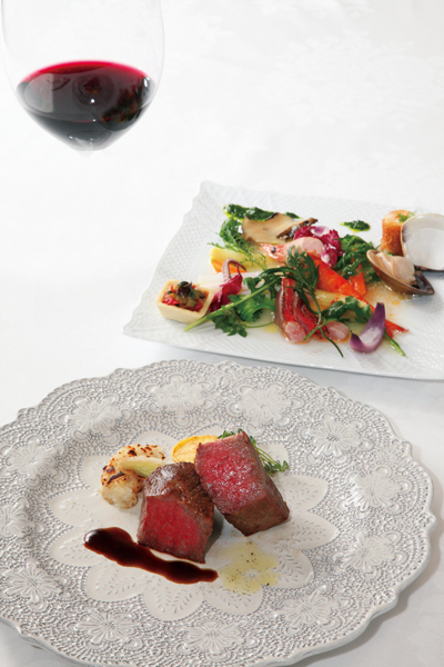 「松阪牛のコース」からメインのステーキと前菜。赤身そのもののステーキは、驚くほどやわらかい(写真:阪本博文(6点とも))