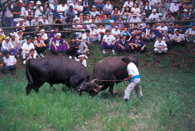 すり鉢状の牛突き場の周囲では700~800人の見学者や関係者が集まり、固唾をのんで勝負の行方を見守る。敗走した牛は半年ほど休ませて、再度チャレンジさせるが、一度負けた牛の復帰は難しいのだとか。まさに誇り高き雄牛の、プライドをかけた戦いなのだ。
