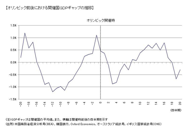 1984年以降のオリンピック開催国でも、オリンピック前後で景気に上振れ/下振れが生じている。まず景気上振れだが、平均すると開催1年ほど前から最大1%あまり潜在成長率を上振れる成長推移となっている(図表2)。