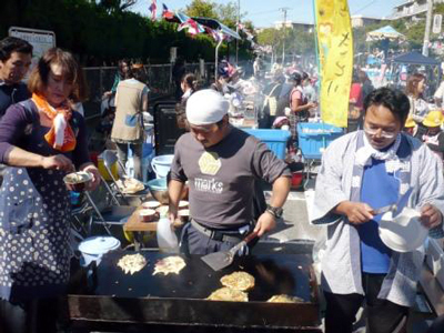 「いいわね、じゃあ5枚お願いね!」と、秋津コミュニティが出店する韓国風のお好み焼きをサークルのお母さんが知人のお母さんにすすめます。