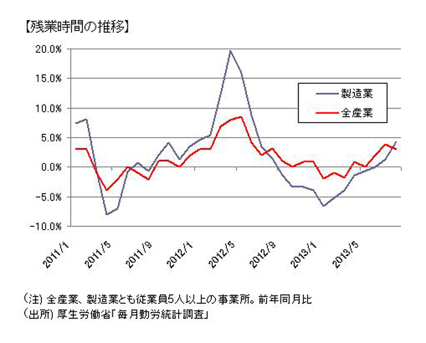 最近の賃金・労働関係の統計指標でまず目に付くのは、残業時間の推移だ。最近、全産業、製造業ともに前年同月比で増加に転じている(図表1)。とくに、製造業では12年8月以来の増加となっていて、今年8月には前年同月比で4.3%増と増加幅を拡大させている。