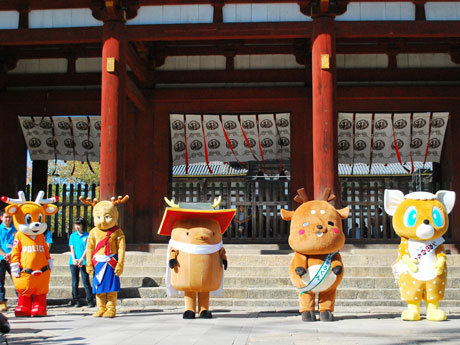 奈良署は9月29日、東大寺中門前(奈良市雑司町)で秋の交通安全県民運動に合わせて交通安全啓発イベントを実施し、鹿をモチーフにしたゆるキャラ5体が集まって飲酒運転根絶を宣言した。