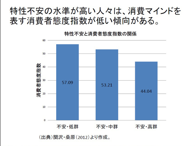 特性不安の水準が高い人々は、消費マインドを表す消費者態度指数が低い傾向がある。