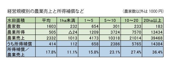 (出所)農林水産省「農業経営統計調査 平成23年」営農類型別経営統計(個別経営、第1分冊、水田作・畑作経営編)(注)原資料の用語を分かりやすく言い換えている。農家数は原資料では経営体数、農業売上は農業粗収益、所得補償は共済・補助金等受取金で、コメの所得補償、水田活用の所得補償、畑作物の所得補償などの合計。農業所得は売上マイナス外部経費で、自家労費+地代+利潤。原資料の面積区分を統合している。数字は農家数で加重平均している。