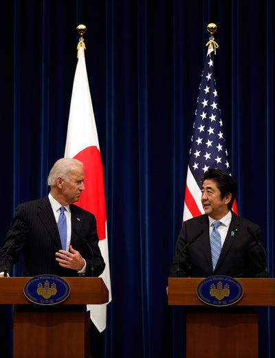 バイデン米副大統領が来日、安倍首相と会談し共同記者会見に臨んだが… (写真:ロイター/アフロ)
