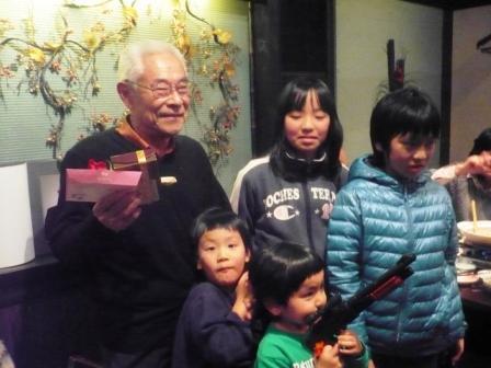 パーティで子どもたちからお祝い品をプレゼントされて喜ぶ嶋村清一さん。2013年12月