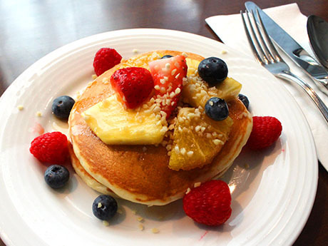 目の前でシェフが焼いてくれ、自由にトッピングできるパンケーキ