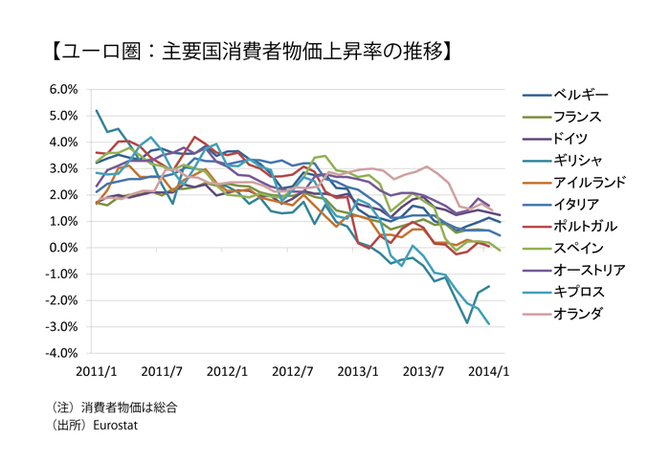 ユーロ圏各国の物価動向にも大きな違いがある。いずれも債務危機国であるキプロス、ギリシャは厳しいデフレとなっている(図表3)。スペインもデフレで、イタリア、ポルトガルといった他の債務危機国でもディスインフレ傾向が著しい。