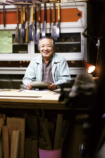 日用品の製作で使われる挽曲(ひきまげ)の技法を極め、木材の静謐な美を引き出す独自の表現を確立。独学で巨大な九谷焼の皿を作陶するなど、常識に縛られないものづくりを貫いてきた。使う人が喜ぶ本物を作るという生一本の職人魂は、人間国宝となったいまも揺らぐことはない。