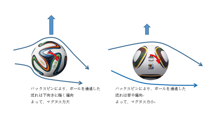 一方で、ジャブラニは、ボールの背後の空気の流れは下向きにいくも、すぐに上向きに転じる。つまり渦を巻いているように乱れる。そのため、ボールはバックスピンがかかっているのに、下向きのマグヌス力が働く。