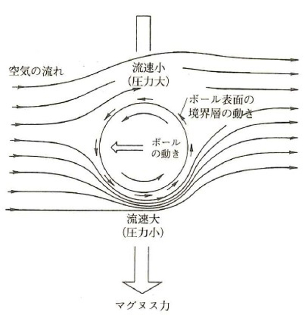 図2で説明すると、ボールの下部は、ボールの回転と空気の流れが一致するため空気は滑らかに速く流れ、圧力は低くなる。上部は圧力が高いため、下向きのマグナス力を得る。これによってボールは下向きに落下する力を受け、予想より早く弧を描きながら落ちていく。