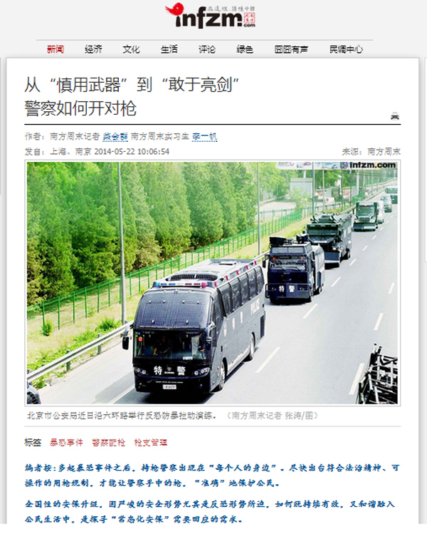 『南方週末』紙の本記事。写真は北京市環状6号線での動員演習に出動する特警車両。装備は急速に向上している拡大画像表示