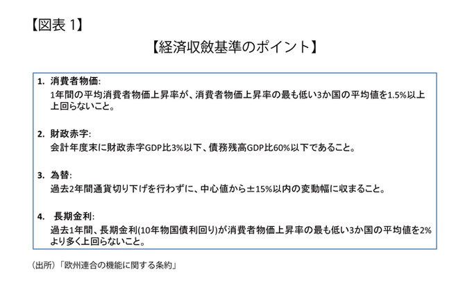 ユーロ圏域内国経済が互いに収斂していない状況は、まずユーロ圏参加に当たって求められる経済収斂基準(図表1)から窺える。そこでは、物価、財政収支、為替相場、金利水準の収斂が求められている。