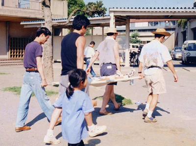 阪神淡路大震災後に習志野市が学校に設置した防災倉庫の簡易担架に子どもを乗せて避難訓練をするお父さんたち。秋津での防災被災訓練を兼ねた一泊キャンプで