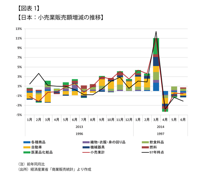また、内閣府が実質ベースで需要・供給両方の統計を元に作成している消費総合指数を見ても、4月以降前年同月比での減少が続いている。しかも、前回消費税が引き上げとなった97年時点と比べても、回復度合いは弱い(図表2)。