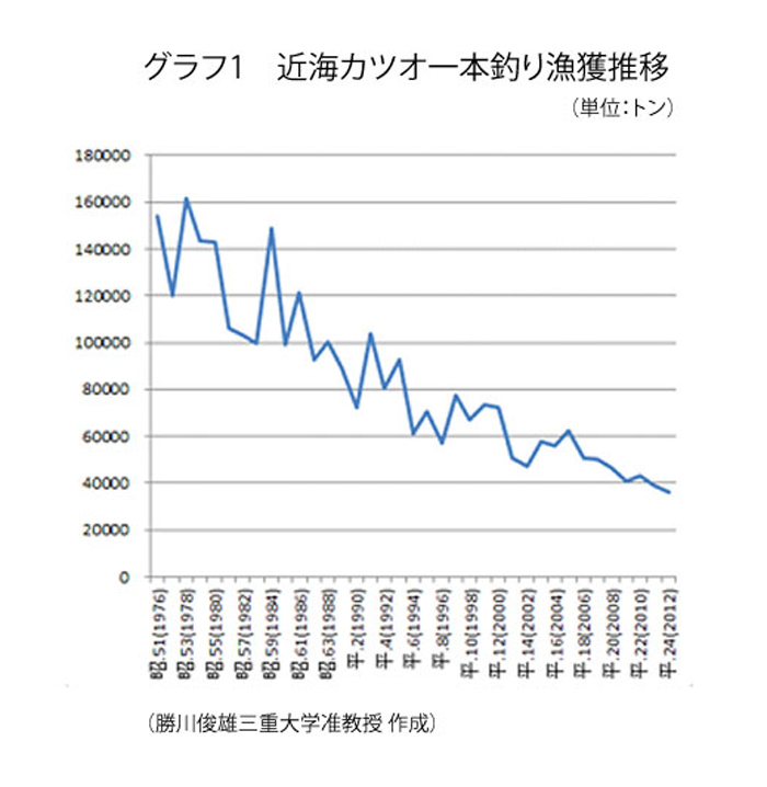 一本釣りで漁獲される日本へ回遊してくるカツオが減っています(グラフ1)。