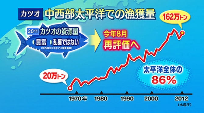 一本釣りの漁場は、群れを探してより遠くなって行き、満船になるまでにかかる日数も長くなっています。加えて燃料価格は高騰を続けコストは上がり続けています。水揚げが大幅に減った年の翌年に少しでも増えると、前年比ですぐに「豊漁」と報道されるために、一般消費者には、中長期的に減少している事実がわからないままになっています。今年のシラスウナギ(ウナギの稚魚)にしても、2013年の5トンという過去最低に比べて、約16トンと増えたために「豊漁」という報道がされていましたが、これも1960年代に200トン獲れていた時に比べれば1/10であり、豊漁とはほど遠いのです(第21回参照)。